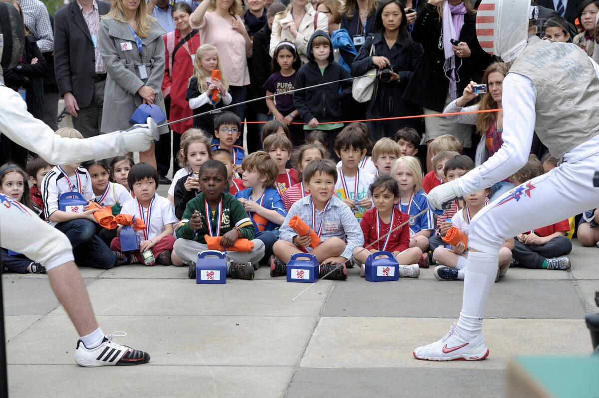 Children of the UN International School (UNIS) watch fencers spar during the special event organized by the Permanent Mission of the United Kingdom, “100 Days to Go to the London 2012 Olympic Games”. Kindergarteners and first-graders representing over 20 countries took part in the event, which included three 100-metre races.