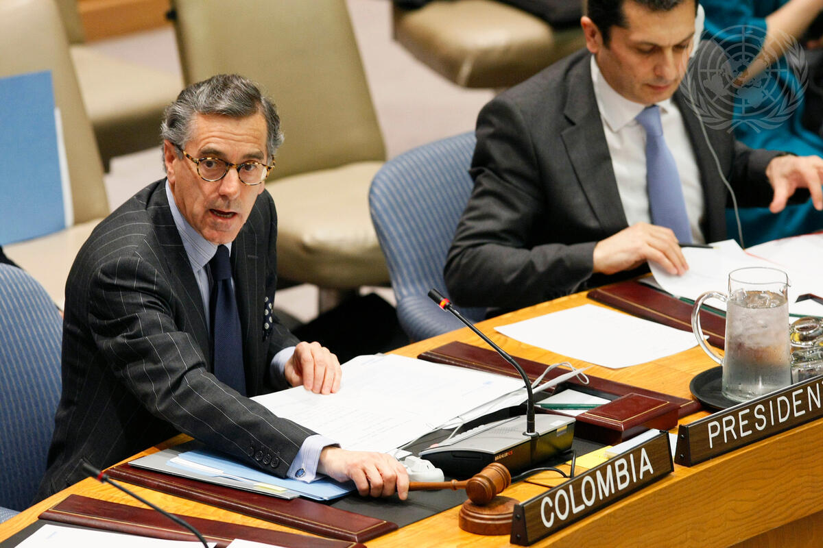 Néstor Osorio (left), Permanent Representative of Colombia to the UN and President of the Security Council for April, chairs a meeting of the Council at which Members unanimously adopted resolution 1977 (2011), extending for 10 years the mandate of the so-called 1540 Committee, responsible for monitoring efforts to prevent the acquisition of weapons of mass destruction (WMD) by terrorists and other non-State actors.