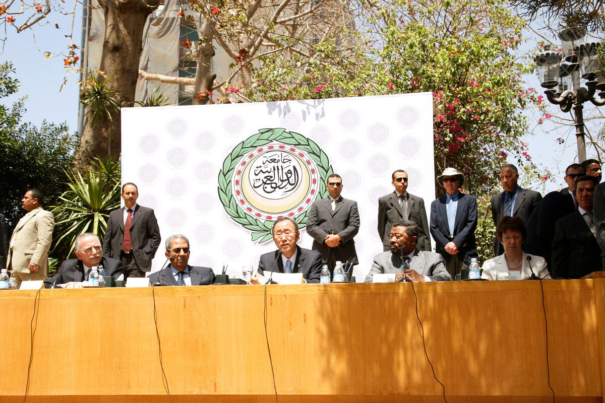 Secretary-General Ban Ki-moon (centre) speaks at the joint press conference held by the heads of major regional organizations – the African Union, the European Union, the League of Arab States, the Organization of the Islamic Conference (OIC) and the United Nations – following their conference on Libya at the League of Arab States headquarters in Cairo, Egypt. From left to right: Ekmeleddin Ihsanoglu, Secretary-General of the Organization of the Islamic Conference (OIC); Amre Moussa, Secretary General of the League of Arab States; Secretary-General Ban Ki-moon; Jean Ping, Chair of the African Union Commission; and Catherine Ashton, High Representative of the European Union for Foreign Affairs and Security Policy.