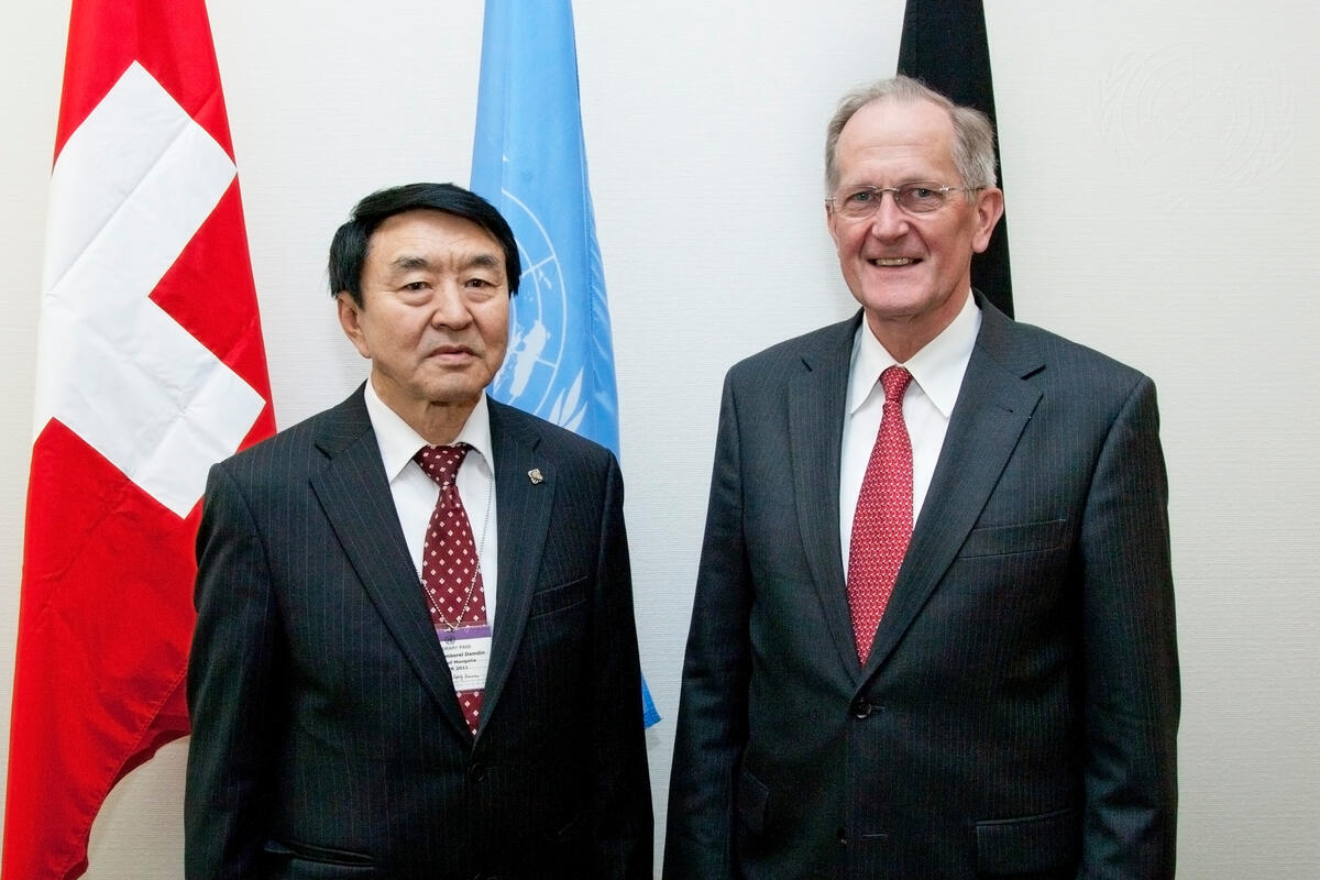 Joseph Deiss (right), President of the sixty-fifth session of the General Assembly, meets with Demberel Damdin, Speaker of the State Great Hural (Parliament) of Mongolia.