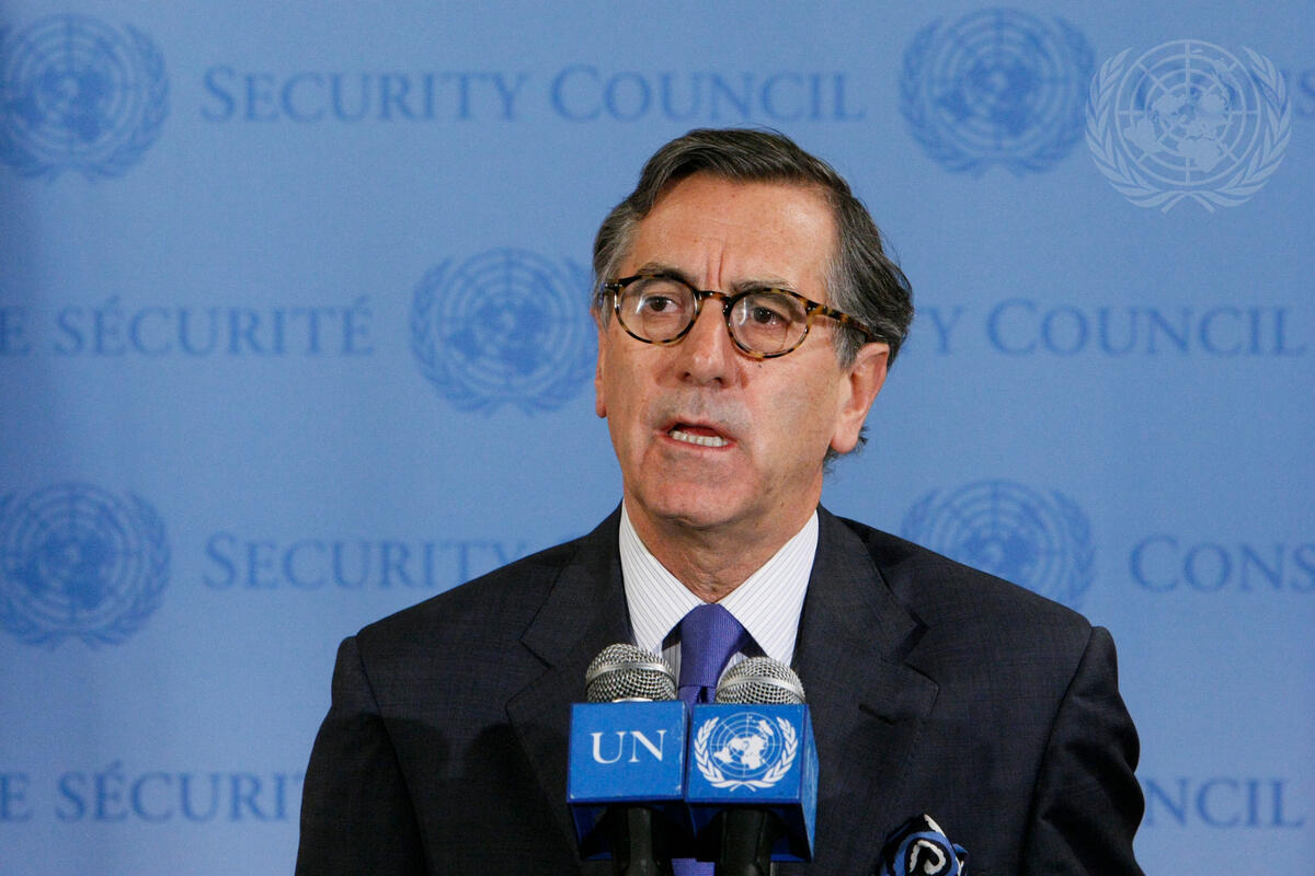 Néstor Osorio, Permanent Representative of Colombia to the UN and President of the Security Council for April, briefs correspondents following Council consultations on the situations in Côte d'Ivoire and in Gaza.
