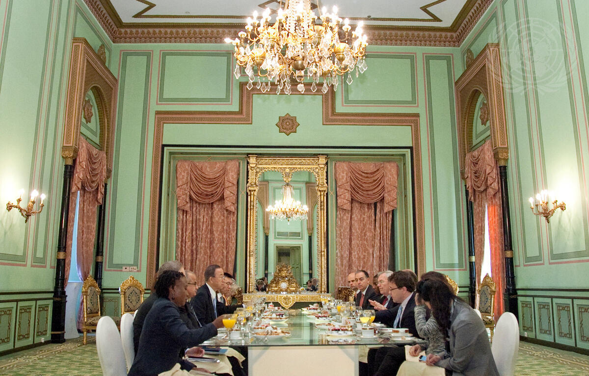 Secretary-General Ban Ki-moon (fourth from left) holds a working breakfast with his senior advisers, including Abdel-Elah Mohamed Al-Khatib (left of Mr. Ban), his Special Envoy to the Libyan Arab Jamahiriya, and B. Lynn Pascoe (across from Mr. Ban), Under-Secretary-General for Political Affairs, in Cairo, Egypt, where Mr. Ban co-chaired an international conference on Libya.