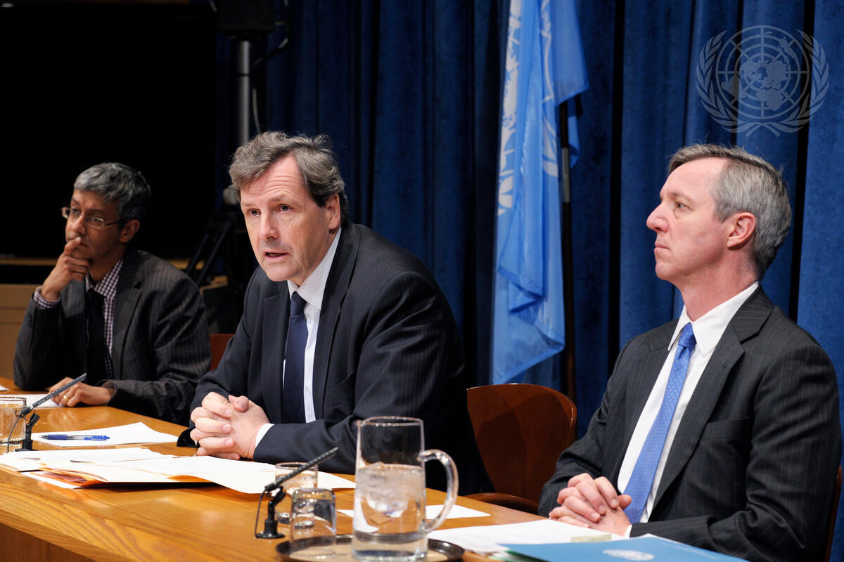 Alain Le Roy (centre), Under-Secretary-General for Peacekeeping Operations, updates correspondents on a range of issues affecting peacekeeping, alongside Anthony Banbury (right), Assistant Secretary-General for Field Support. Pictured left is Farhan Haq, Associate Spokesperson for Secretary-General Ban Ki-moon.