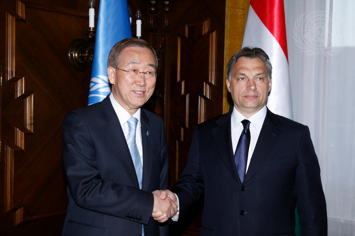 Secretary-General Ban Ki-moon (left) meets with Viktor Orbán, Prime Minister of the Republic of Hungary, at the Office of the Prime Minister in Budapest, Hungary.