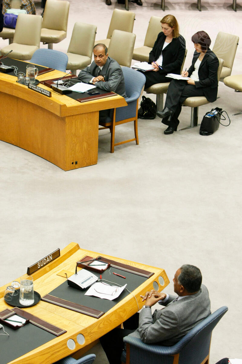 Atul Khare (top), Assistant Secretary-General for Peacekeeping Operations, briefs the Security Council on the situation in Darfur, Sudan, on the peace process in the region and on the work of the African Union-United Nations Hybrid Operation in Darfur (UNAMID). Pictured below is Daffa-Alla Elhag Ali Osman, Permanent Representative of the Republic of the Sudan to the UN.