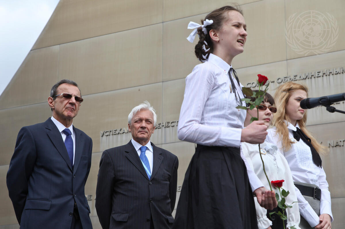 Pictured are Sergei Ordzhonikidze (left), Director-General of the United Nations Office at Geneva (UNOG), and Valery Loshchinin (second from left), Permanent Representative of the Russian Federation to UNOG, as young Russian women recite speeches and poems at the 50th anniversary commemoration of cosmonaut Yuri Gagarin’s first flight in space, at the Monument to the Explorers of Space, in Ariana Park, Geneva.