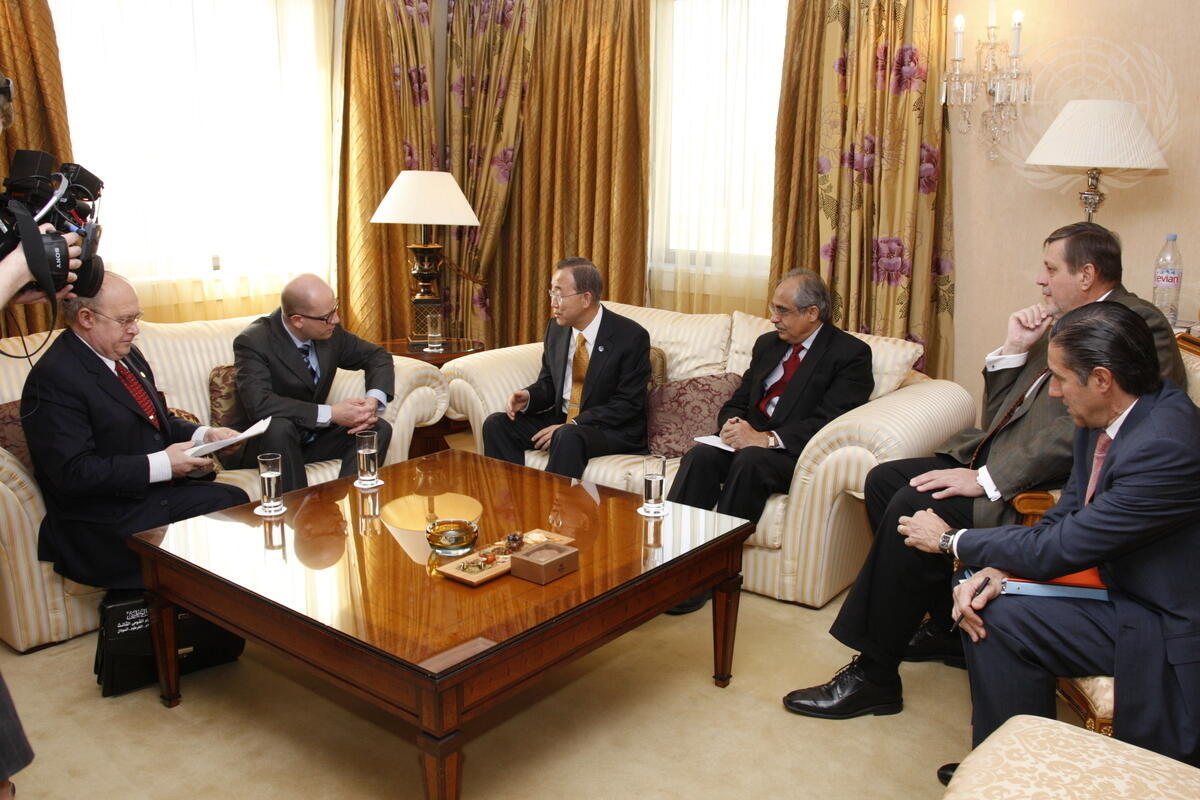 Secretary-General Ban Ki-moon (third, left) meets with Bohuslav Sobotka (second, left), Leader of the Czech Social Democratic Party (CSSD) and Jan Kavan (first, left), former President of the fifty-seventh session of the General Assembly and former Deputy Prime Minister and Foreign Minister of the Czech Republic. Next to the Secretary-General is Vijay Nambiar, Chef de Cabinet.