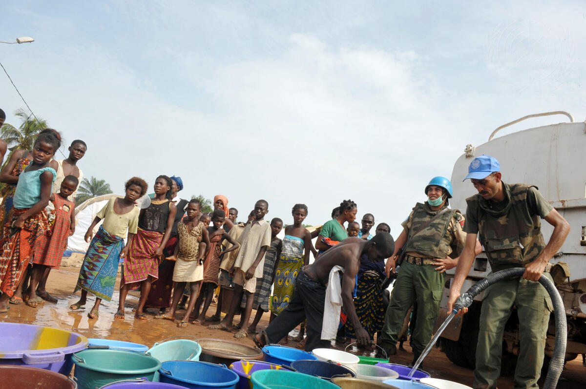 The Moroccan contingent of the UN Operation in Côte d'Ivoire (UNOCI) provides water to people displaced by violence in Duékoué, in the western Moyen-Cavally region of Côte d'Ivoire. The area has been plunged into crisis since fighting erupted between military forces loyal to former Ivorian President Laurent Gbagbo and supporters of the internationally-recognized new president, Alassane Ouattara.