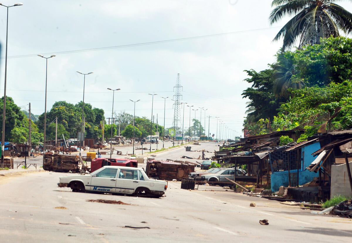 Supporters of President Alassane Ouattara, calling themselves “Invisible Commandos”, mount a barricade of cars in the Abobo neighbourhood of Abidjan, Côte d'Ivoire. They have squared off against forces loyal to former Ivorian President Laurent Gbagbo, who has refused to relinquish office to Mr. Ouattara, his internationally-recognized successor.