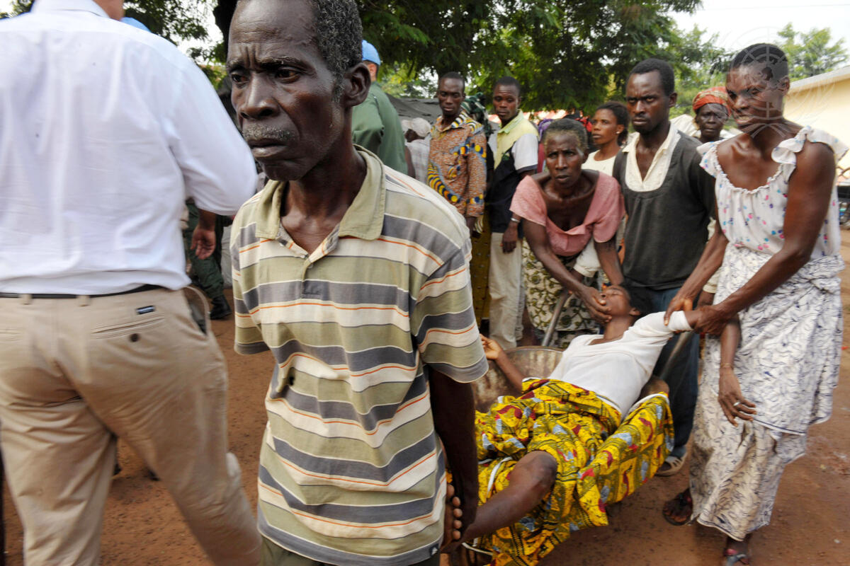 An ailing woman is carried through a camp for people displaced by violence in Duékoué, in the western Moyen-Cavally region of Côte d'Ivoire. The area has been plunged into crisis since fighting erupted between military forces loyal to former Ivorian President Laurent Gbagbo and supporters of the internationally-recognized new president, Alassane Ouattara. A delegation from the UN Operation in Côte d'Ivoire (UNOCI) visited the camp, which is assisted by a Catholic mission.