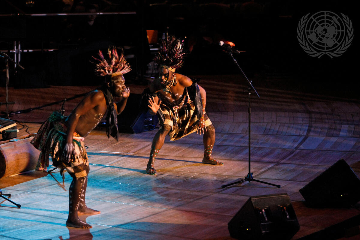 A view of African dancers performing in the UN annual concert commemorating the International Day of Remembrance of the Victims of Slavery and The Transatlantic Slave Trade, on the theme “The Living Legacy of 30 Million Untold Stories”, inside UN Headquarters' General Assembly Hall.