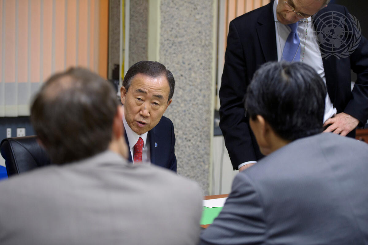 Secretary-General Ban Ki-moon (seated centre) confers with his senior advisers, including Spokesperson Martin Nesirky (standing); Robert Orr (left), Assistant Secretary-General for Policy Coordination and Strategic Planning; and Kim Won-soo (right), his Deputy Chef de Cabinet; before holding a press conference on the situations in Libya, Japan, Côte d'Ivoire and Afghanistan. The UN mission in Afghanistan (UNAMA) reported earlier today that protesters had stormed its offices in Mazar-i-Sharif, killing at least seven, including UN personnel.