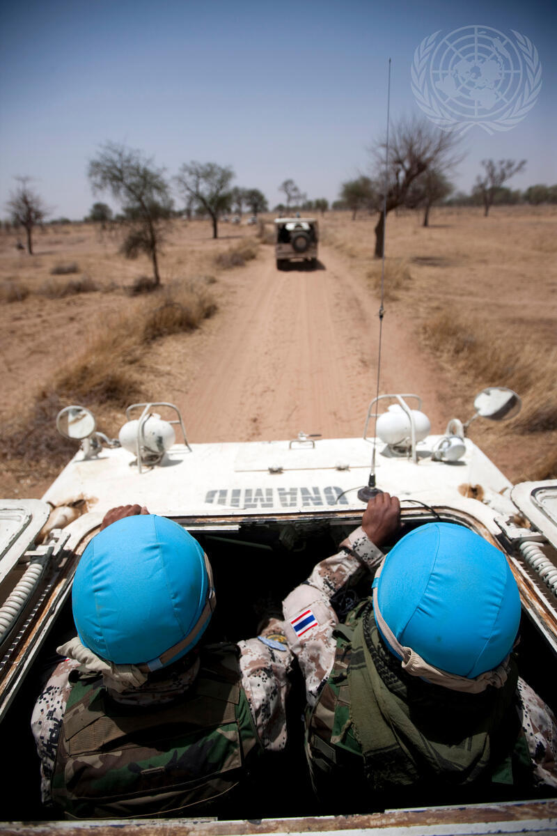 Officers of the African Union-United Nations Hybrid Operation in Darfur (UNAMID) are shown on patrol near Buru, West Darfur, approximately 50 kilometres away from the officers’ team site in Mukhjar. Community leaders from the area have complained over lack of access to water, healthcare, and education.