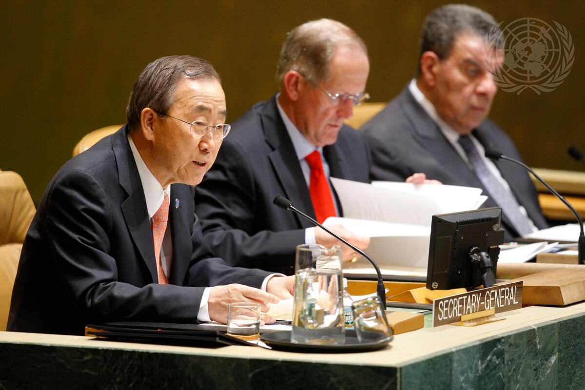 Secretary-General Ban Ki-moon (left) addresses an informal meeting of the General Assembly with civil society partners in the run-up to the Assembly’s High-level Meeting on HIV/AIDS (8-10 June 2011). With Mr. Ban are Joseph Deiss (centre), President of the sixty-fifth session of the Assembly, and Muhammad Shaaban (left), Under-Secretary-General for General Assembly Affairs and Conference Management.
