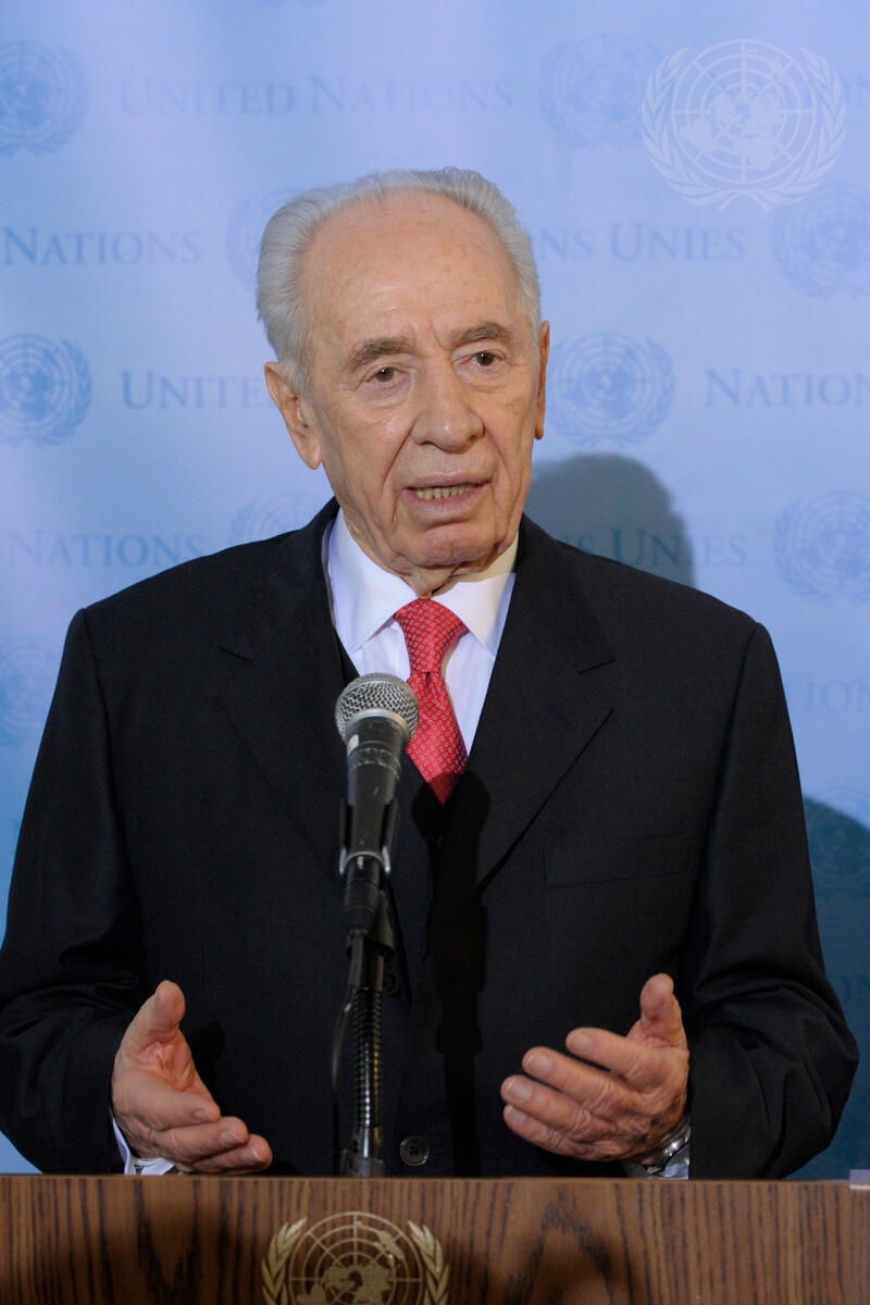 Shimon Peres, President of Israel, briefs reporters following his meeting with Secretary-General Ban Ki-moon.