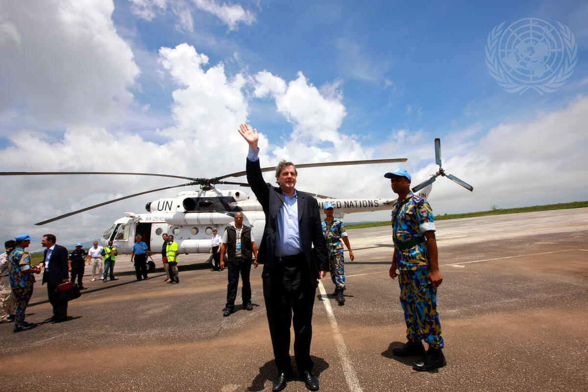 Alain Le Roy, Under-Secretary-General for Peacekeeping Operations waves to members of the Bangladeshi Formed Police Unit (FPU) and UN colleagues as he arrives in Baucau, Timor-Leste.