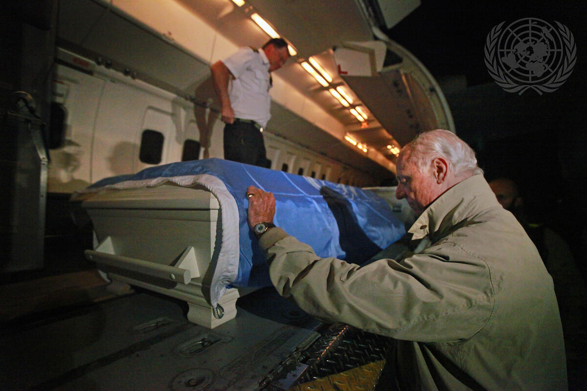 Staffan de Mistura, Special Representative of the Secretary-General for Afghanistan and Head of the UN mission in that country (UNAMA), takes a moment to mourn one of the seven colleagues killed yesterday in an attack on a Mazar-i-Sharif operations centre, as caskets of the fallen staff members arrive at Kabul International Airport.