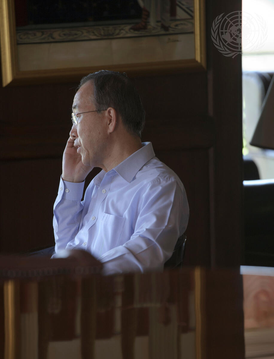 Secretary-General Ban Ki-moon is shown during a phone call with the Prime Minister of Sweden, expressing his condolences after the passing of one of Sweden’s citizens in the attack, 1 April, on a UN office in Mazar-i-Sharif, Afghanistan. The incident claimed the lives of seven UN staff members from Nepal, Norway, Romania and Sweden.