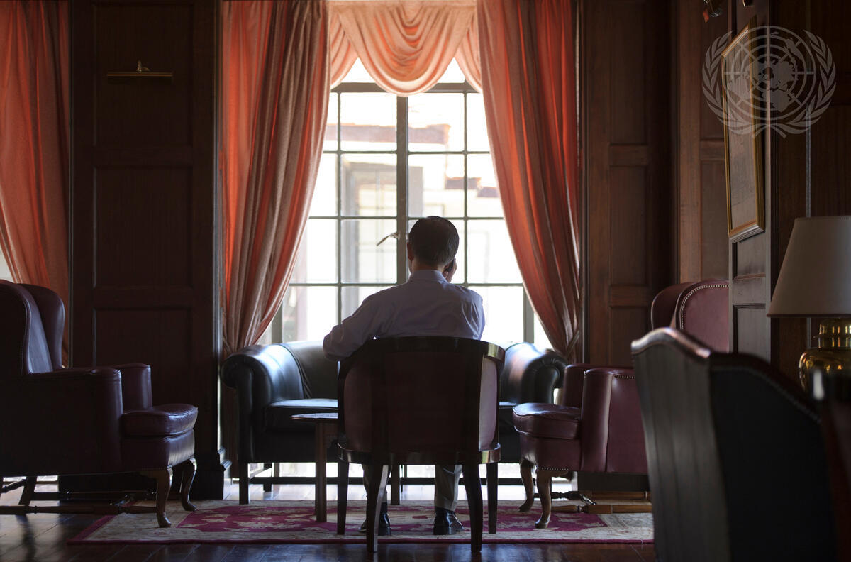 Secretary-General Ban Ki-moon is shown during a phone call with the Prime Minister of Norway, expressing his condolences after the passing of one of Norway’s citizens in the attack, 1 April, on a UN office in Mazar-i-Sharif, Afghanistan. The incident claimed the lives of seven UN staff members from Nepal, Norway, Romania and Sweden.