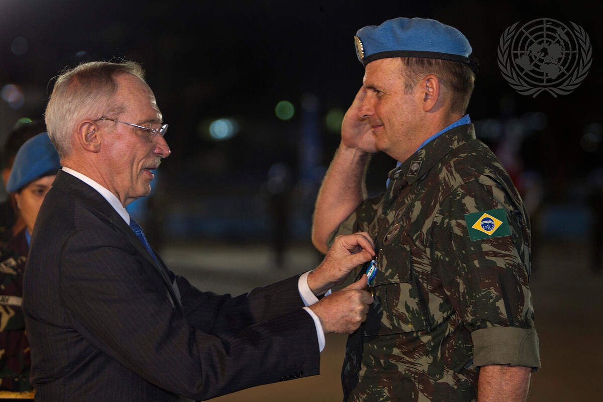 Edmond Mulet, Special Representative of the Secretary-General for Haiti and Head of the United Nations Stabilization Mission in Haiti (MINUSTAH), gives a medal to Major General Luiz Guilherme Paul Cruz (right), outgoing Force Commander of MINUSTAH.