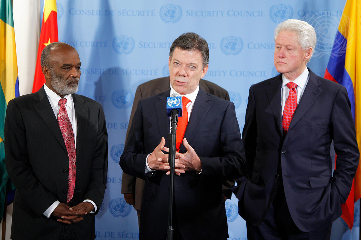 President of Colombia Juan Manuel Santos Calderón (centre) briefs reporters following a meeting of the Security Council, organized by the Colombian mission to the UN, on renewed international commitment to Haiti. Mr. Santos Calderón chaired the meeting as his country holds the Council’s rotating presidency for the month. With him are René Garcia Préval (left), President of Haiti, and William J. Clinton, UN Special Envoy to Haiti and former President of the United States.