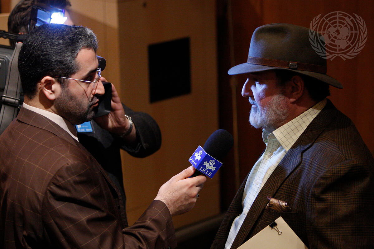Abdullah Hussain Haroon (right), Permanent Representative of Pakistan to the UN, speaks with a reporter from Islamic Republic of Iran Broadcasting (IRIB) following a press conference held by Mr. Haroon, alongside the representatives of Tajikistan and the Organization of the Islamic Conference (OIC), on the burning of a Koran on 20 March, 2011, at Dove World Outreach Center in Gainesville, Florida, the church of Pastor Terry Jones. Mr. Jones was widely covered in the media when he threatened to burn the Koran on the anniversary of the 9/11 attacks last year.