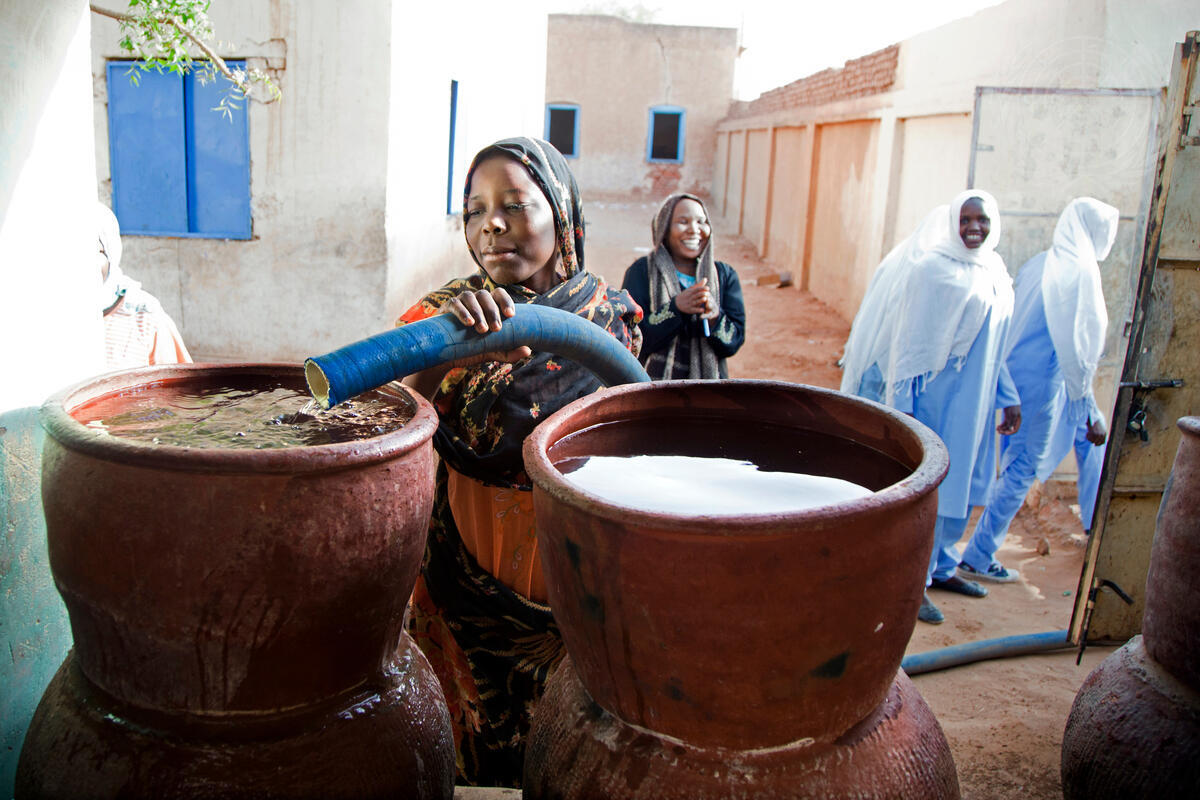 Students of al-Um Secondary School for Girls in El Fasher, Sudan, receive water delivered by tanker by the UN African Union-United Nations Hybrid Operation in Darfur (UNAMID). At the request of the North Darfur State Ministry of Education, UNAMID is providing 100,000 litres of potable water each day to nearly 12,000 students at examination centres and dormitories during the State’s month-long secondary examination period. Many of the students have to travel to El Fasher from smaller villages for a chance to take the exams.