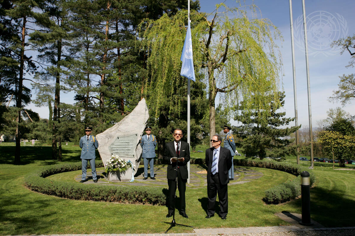 General view of the wreath-laying ceremony in Ariana Park, United Nations Office at Geneva, to honour the United Nations staff members who lost their lives in the service of peace.