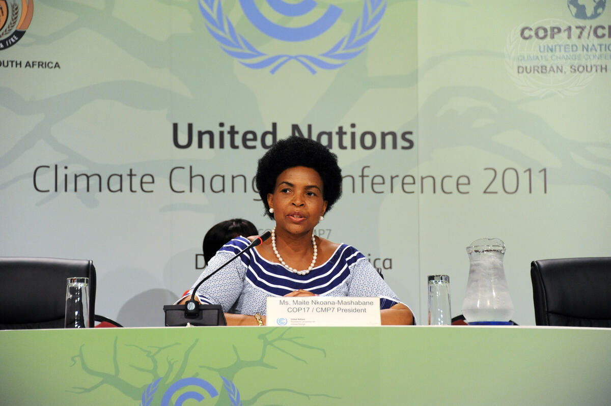 Maite Nkoana-Mashabane, Minister for International Relations and Cooperation of South Africa and President of the COP17/CMP7 UN Climate Change Conference, delivers closing remarks on the final day of the conference in Durban, South Africa.