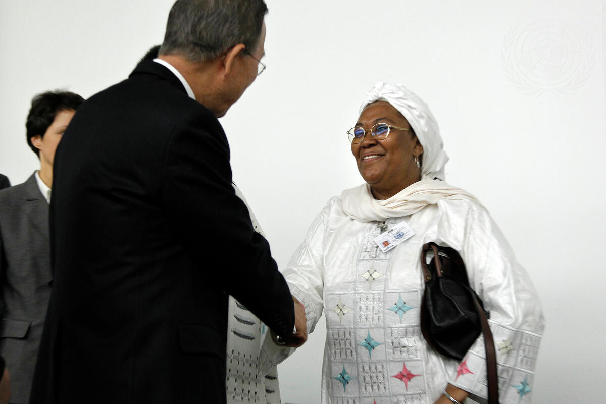 Secretary-General Ban Ki-moon (left) greets Maikibi Kadadiatou Dandobi, Niger's Minister of Population, Women's Promotion and Child Protection, at the annual high-level conference on the Central Emergency Response Fund (CERF).