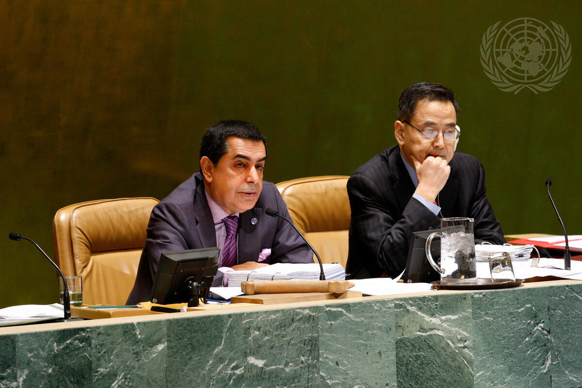 Nassir Abdulaziz Al-Nasser (left), President of the sixty-sixth session of the General Assembly, chairs the Assembly meeting that featured a report of the Third Committee.