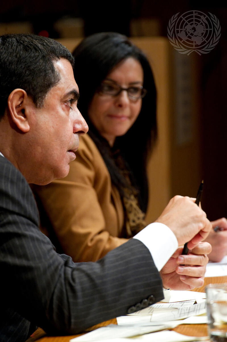 Nassir Abdulaziz Al-Nasser (left), President of the sixty-sixth session of the General Assembly, briefs correspondents on the Assembly’s work in its current session. With the President is his Spokesperson, Nihal Saad.