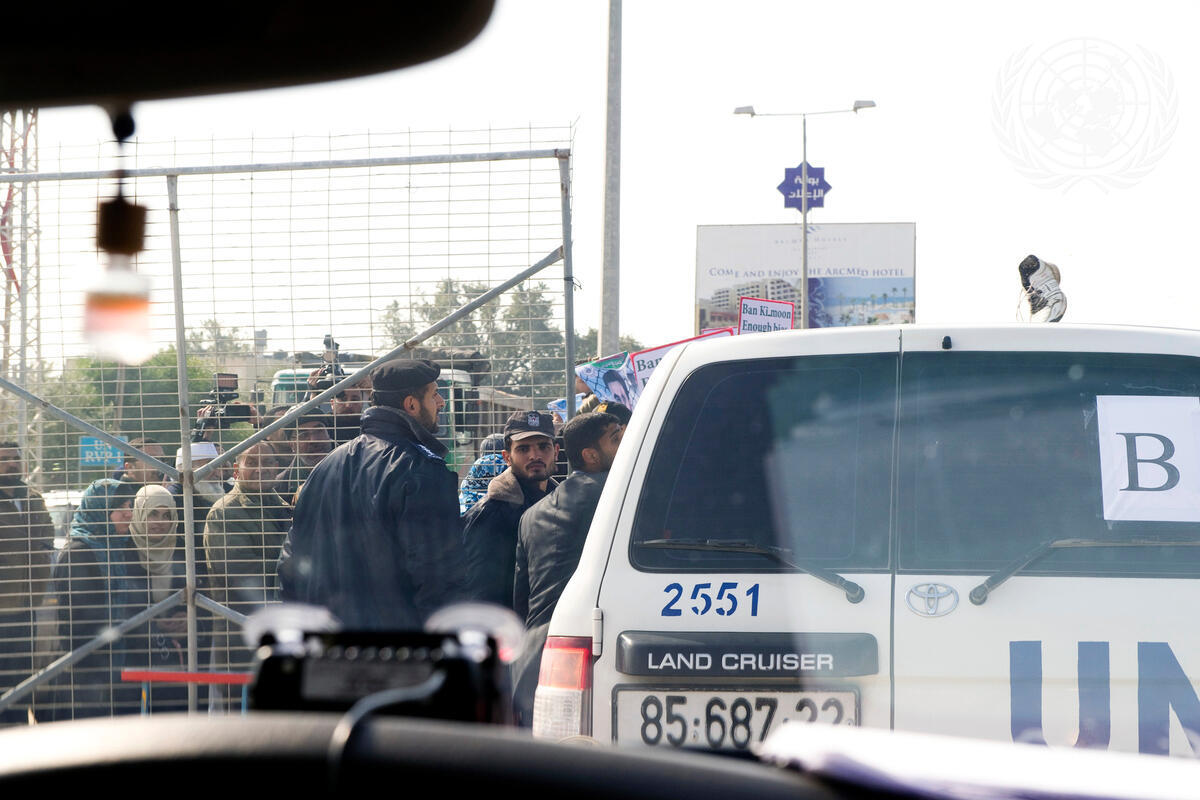 Dozens of Palestinians, many of whom relatives of prisoners in Israeli jails, stage a protest, throwing shoes and other objects, as Secretary-General Ban Ki-moon’s convoy crosses into Gaza from Israel.