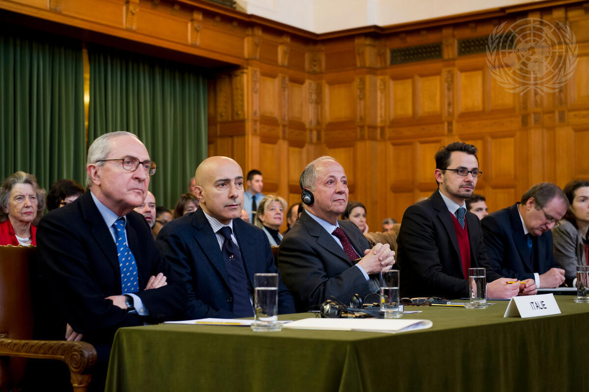Vue de la délégation italienne : (de g. à d.) M. Paolo Pucci di Benisichi, ambassadeur et conseiller d’Etat, agent de l’Italie, et M. Giacomo Aiello, avocat de l’Etat, coagent de l’Italie, lors de la lecture de l’arrêt de la Cour en l’affaire relative aux Immunités juridictionnelles de l’Etat (Allemagne c. Italie ; Grèce (intervenant)).