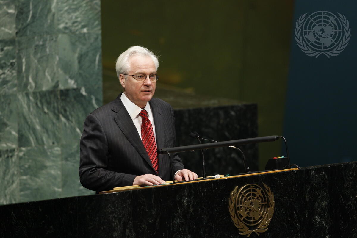 Vitaly I. Churkin, Permanent Representative of the Russian Federation to the UN, addresses a meeting of the General Assembly on Syria.