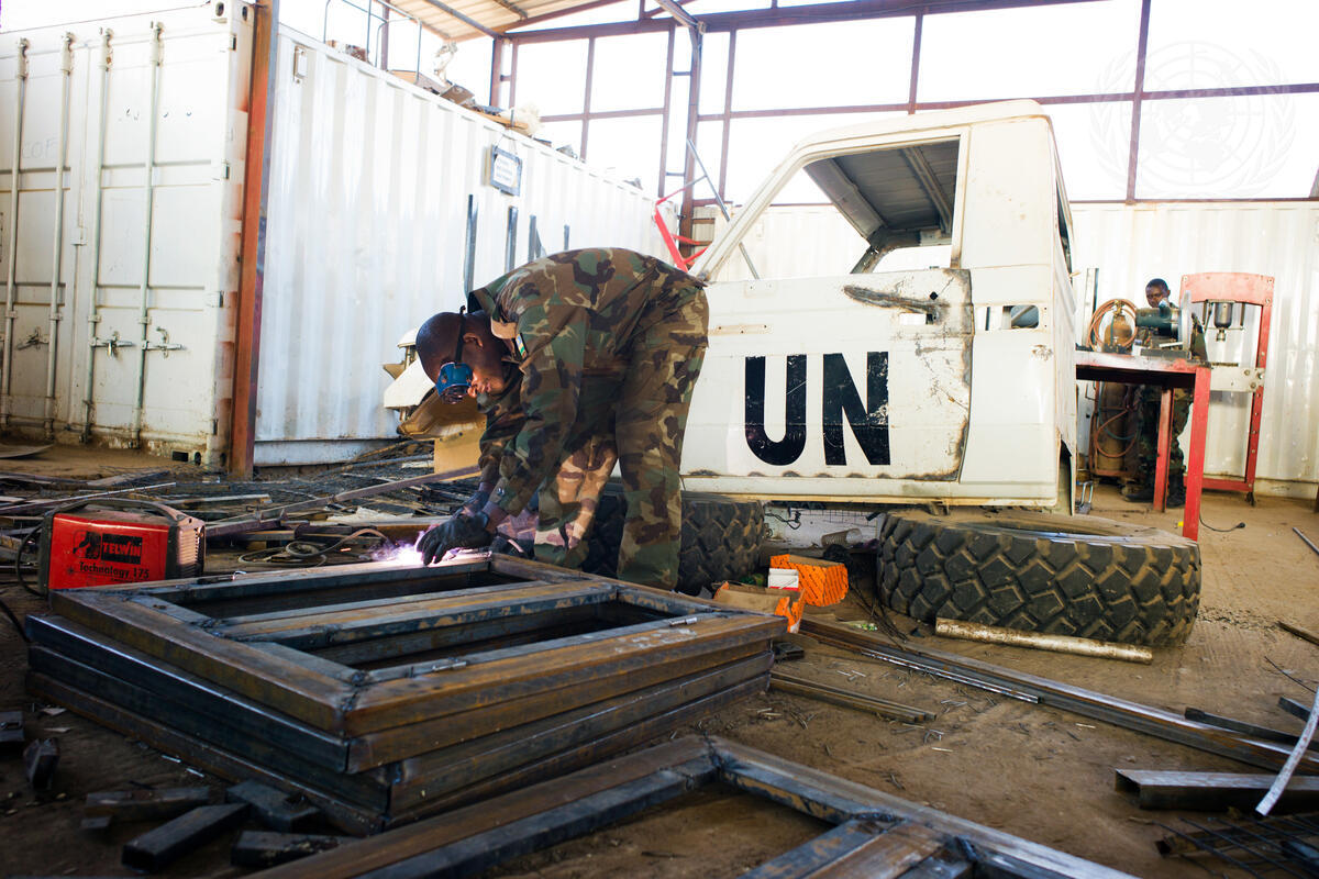A Rwandan troop with the African Union-UN Hybrid Operation in Darfur (UNAMID) is shown at the contingent’s mechanical workshop in Zam Zam, North Darfur.