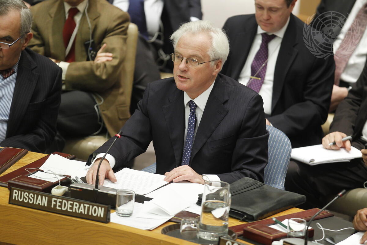 Vitaly I. Churkin, Permanent Representative of the Russian Federation to the UN, addresses the Security Council after the Council’s vote on a draft resolution concerning Syria. The draft, which demands an end to the violence by the Syrian Government against its people and supports the League of Arab States decision to facilitate a Syrian-led political transition to democracy, was voted in favour by thirteen Members of the Council and vetoed by Mr. Churkin along with Li Baodong of China.