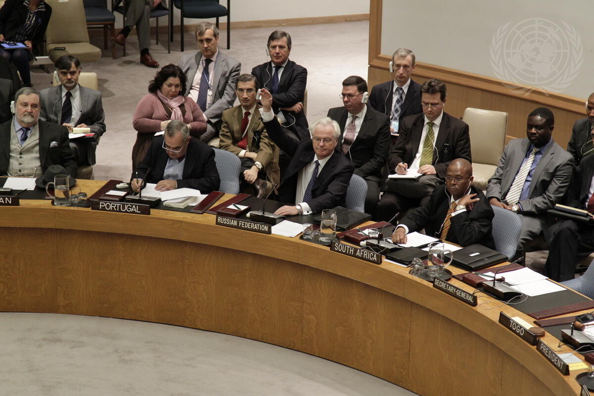A view of the Security Council as Vitaly I. Churkin (second from right), Permanent Representative of the Russian Federation to the UN, vetoes a draft resolution on Syria. The draft demands the Syrian Government cease all violence, withdraw armed forces from cities and towns, and allow for peaceful demonstrations, and supports the League of Arab States’ 22 January decision to facilitate a Syrian-led political transition to a democratic system. China also vetoed the resolution, with the remaining thirteen Members of the Council voting in its favour.