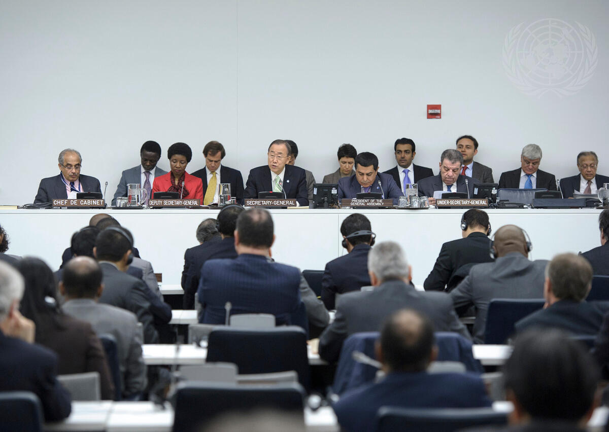 Secretary-General Ban Ki-moon (centre) presents the General Assembly with the agenda for his second term, which highlights sustainable development, conflict prevention and support for nations in transition, among other key areas of action. Remarking on a rapidly changing world, Mr. Ban reminded Member States that the United Nations continues to be the global venue for action, partnership and creating “the future we want”.