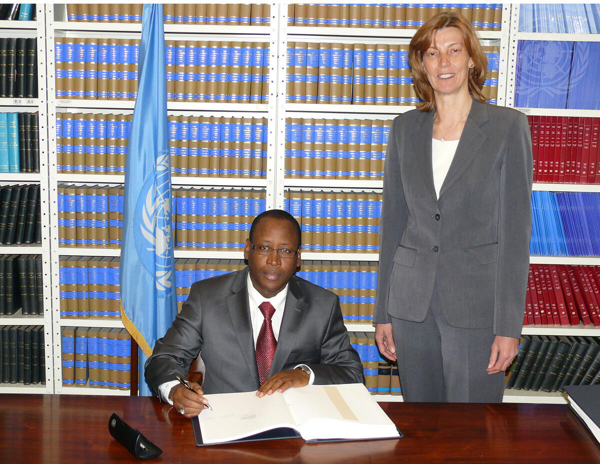 Abdou Salam Diallo (seated), Permanent Representative of Senegal to the UN, signs the Nagoya - Kuala Lumpur Supplementary Protocol on Liability and Redress to the Cartagena Protocol on Biosafety. Next to Mr. Diallo is Gabriele Goettsche-Wanli, Chief of the Treaty Section in the UN Office of Legal Affairs.