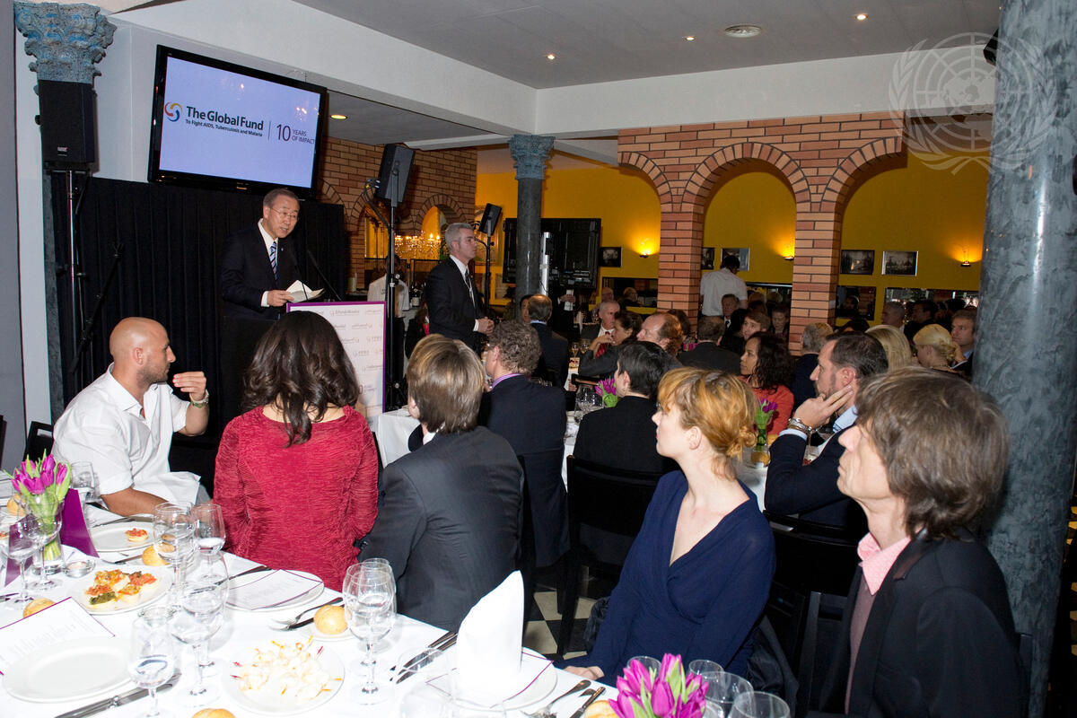 Secretary-General Ban Ki-moon (at podium) speaks at a dinner co-hosted by him and Bill Gates, celebrating the tenth anniversary of the Global Fund to Fight AIDS, Tuberculosis and Malaria, in Davos, Switzerland.