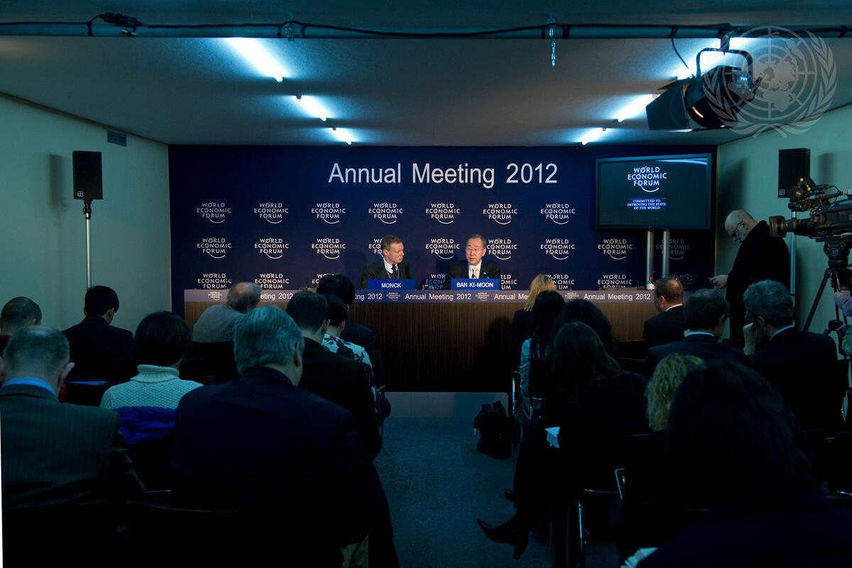 A wide view of the press conference held by Secretary-General Ban Ki-moon (right, facing camera) at the annual World Economic Forum in Davos, Switzerland. Next to Mr. Ban is Adrian Monck, Head of Communications at the Forum.