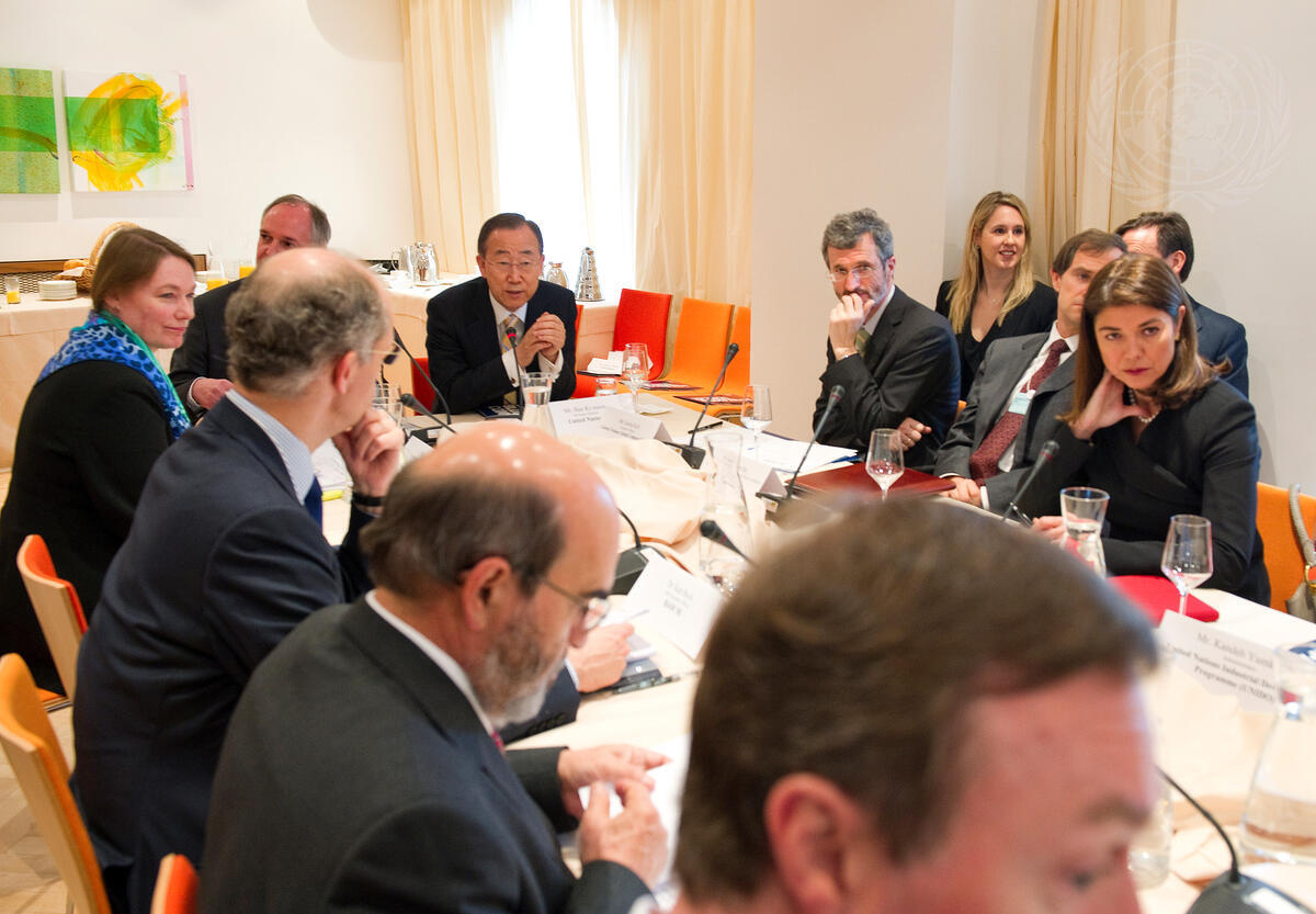 Secretary-General Ban Ki-moon (head of table, right) speaks at a meeting on “Catalyzing Transformational Partnerships Between the UN & Business”, on the sidelines of the annual World Economic Forum in Davos, Switzerland.