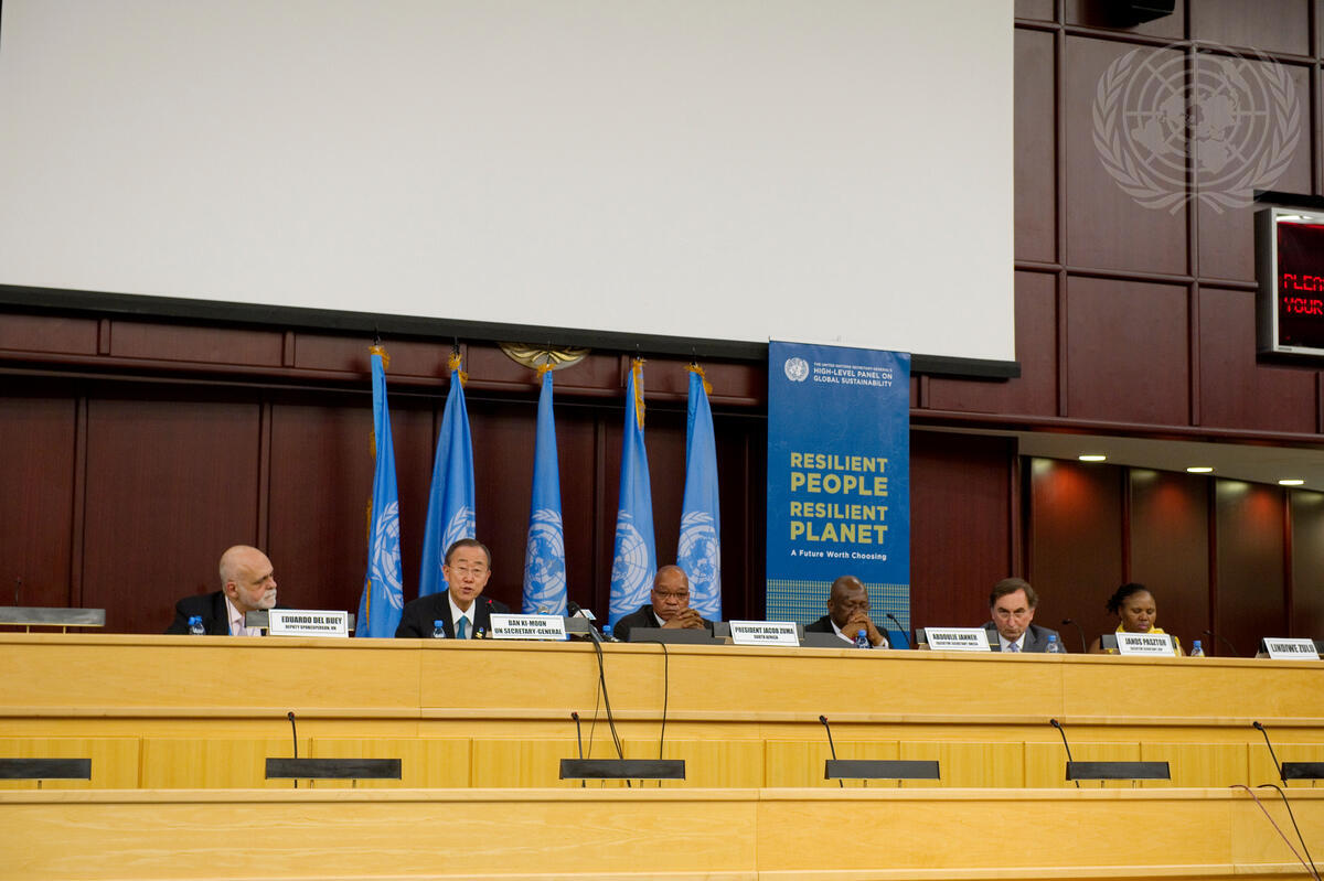 Secretary-General Ban Ki-moon (second from left) speaks at the launch of the report, ""Resilient People, Resilient Planet: A Future Worth Choosing"", by his High-Level Panel on Global Sustainability, in Addis Ababa, Ethiopia. With him at the launch (from left): Eduardo Del Buey, Deputy Spokesperson for Mr. Ban; Jacob Zuma, President of South Africa and Co-Chair of the Panel; Abdoulie Janneh, Executive Secretary of the Economic Commission for Africa (ECA); Janos Pasztor, Director of the Secretary-General's Climate Change Support Team; and Lindiwe Zulu, Ambassador of South Africa and Sherpa for Mr. Zuma.