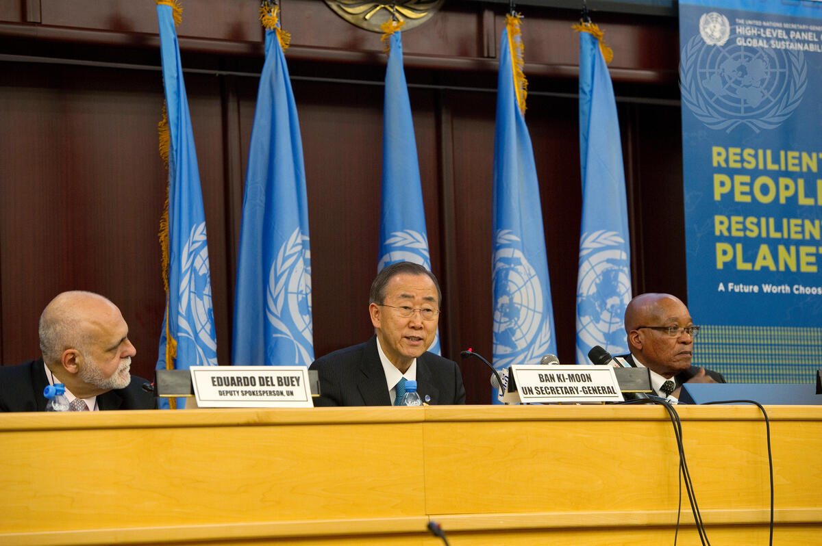 Secretary-General Ban Ki-moon (centre) speaks at the launch of the report by his High-Level Panel on Global Sustainability, ""Resilient People, Resilient Planet: A Future Worth Choosing"", in Addis Ababa, Ethiopia. He is flanked by the Panel’s Co-Chair, South African President Jacob Zuma, and his Deputy Spokesperson, Eduardo Del Buey.