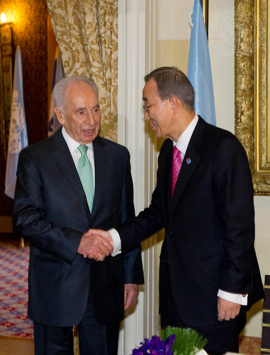 Secretary-General Ban Ki-moon (right) meets with Shimon Peres, President of Israel, shortly after his arrival in Jerusalem.