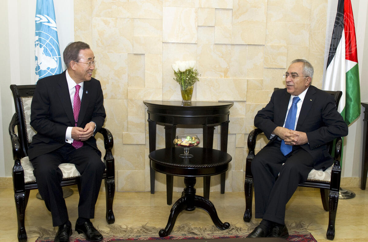Secretary-General Ban Ki-moon (left) meets with Salam Fayyad, Prime Minister of the Palestinian Authority, in Ramallah, West Bank.