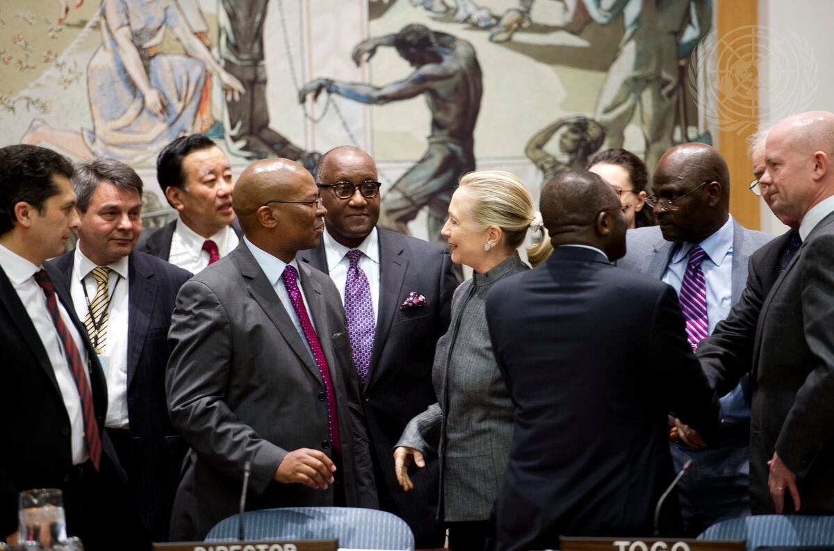 Baso Sangqu (centre left, in red tie), Permanent Representative of South Africa to the UN and President of the Security Council for January, chats with United States Secretary of State Hillary Rodham Clinton (centre right), before the Council’s meeting on the situation in Syria.