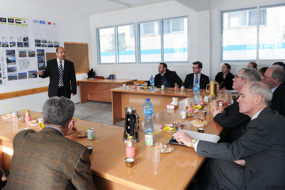 Eamon Gilmore (second from right, in glasses), Deputy Prime Minister and Minister for Foreign Affairs of Ireland, listens to a briefing by Munir Manneh, Engineer with the UN Relief and Works Agency for Palestine Refugees in the Near East (UNRWA), on the progress of UN-funded construction projects in Gaza.