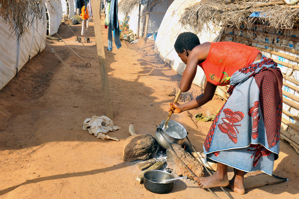 A local villager cooking between rows of temporary housing.